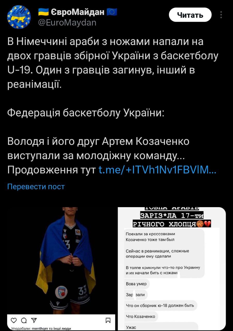 В комментариях под сообщением о гибели украинского баскетболиста в Дюссельдорфе пишут, что его зарезала группа арабов - якобы за украинскую символику на одежде.