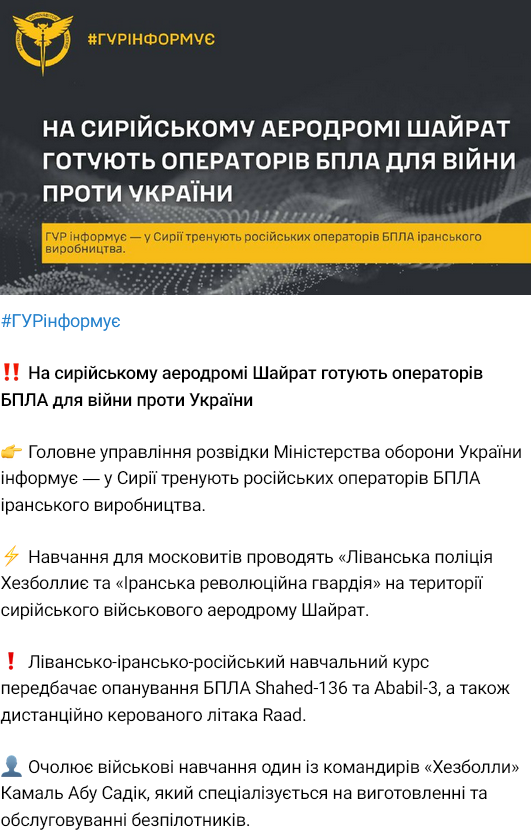 "Обучение проводят "Ливанская полиция Хезболлы" и "Иранская революционная гвардия" на территории сирийского военного аэродрома Шайрат. Ливанско-иранско-российский учебный курс предусматривает освоение БПЛА Shahed-136 и Ababil-3, а также дистанционно управляемого самолета", - говорится в сообщении.