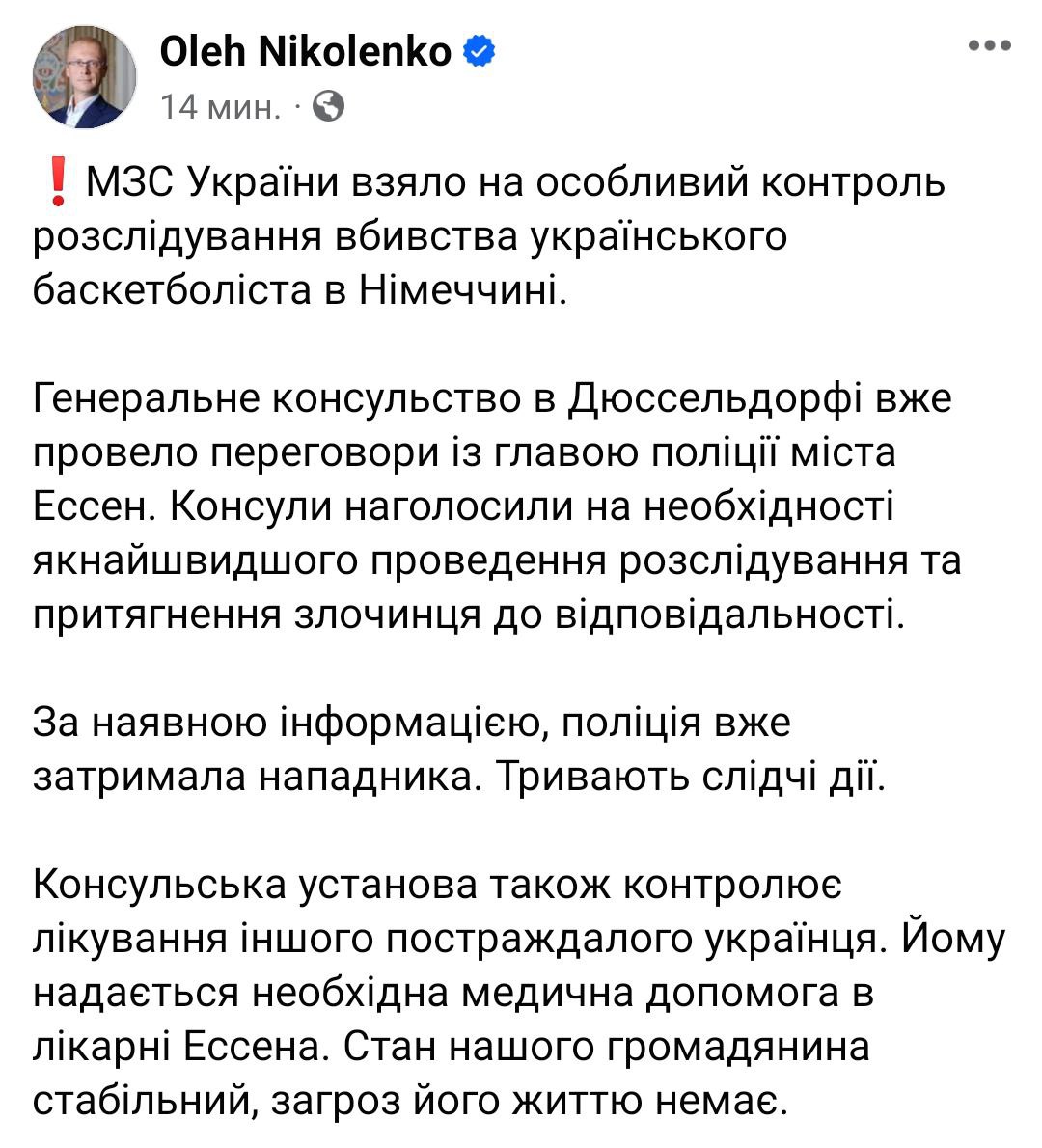 "Генеральное консульство в Дюссельдорфе уже провело переговоры с главой полиции города Эссен. Консулы отметили необходимость скорейшего проведения расследования и привлечения преступника к ответственности", – добавил представитель МИД.