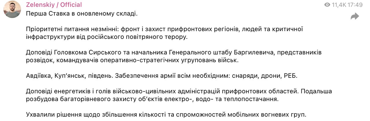 "Приоритетные вопросы неизменны: фронт и защита прифронтовых регионов, людей и критической инфраструктуры от российского воздушного террора. Доклады главкома Сырского и начальника Генерального штаба Баргилевича, представителей разведок, командующих оперативно-стратегическими группировками войск", - написал Зеленский.