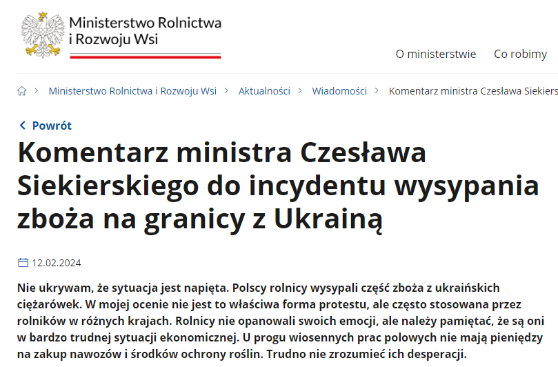 Министр сельского хозяйства и развития села Польши Чеслав Секерский, извинился за случай с рассыпанным украинским зерном польскими фермерами на границе. Он отметил, что это произошло в эмоциональном порыве в условиях сложной экономической ситуации.