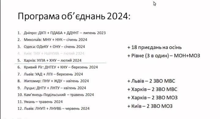 В частности, уже в 2024 году могут объединить вузы в Днепре, Николаеве, Одессе, Харькове, Кривом Роге, Львове, Житомире, Луцке, Каменец-Подольском, Ровно и Умани, как показано в таблице.