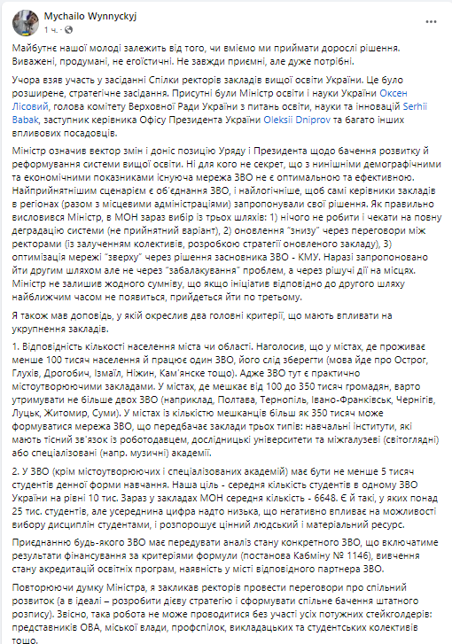 Заместитель министра образования и науки Украины Михаил Винницкий предложил в городах с населением от 100 до 350 тысяч человек оставить не более двух вузов. Он отметил, что в городах с населением до 100 тысяч нужно сохранить один вуз.