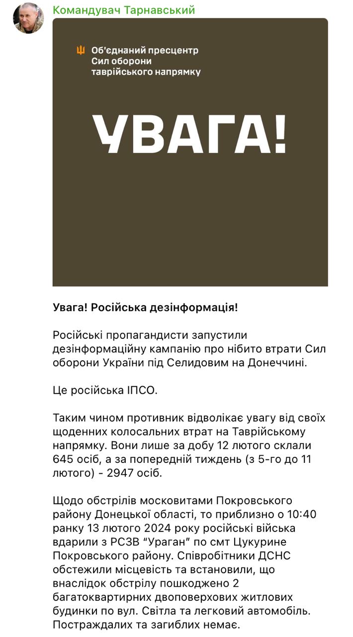 "Таким образом противник отвлекает внимание от своих ежедневных колоссальных потерь на Таврическом направлении. Они только за сутки 12 февраля составили 645 человек, а за предыдущую неделю (с 5 по 11 февраля) - 2947 человек", - сказано в посте Тарнавского.