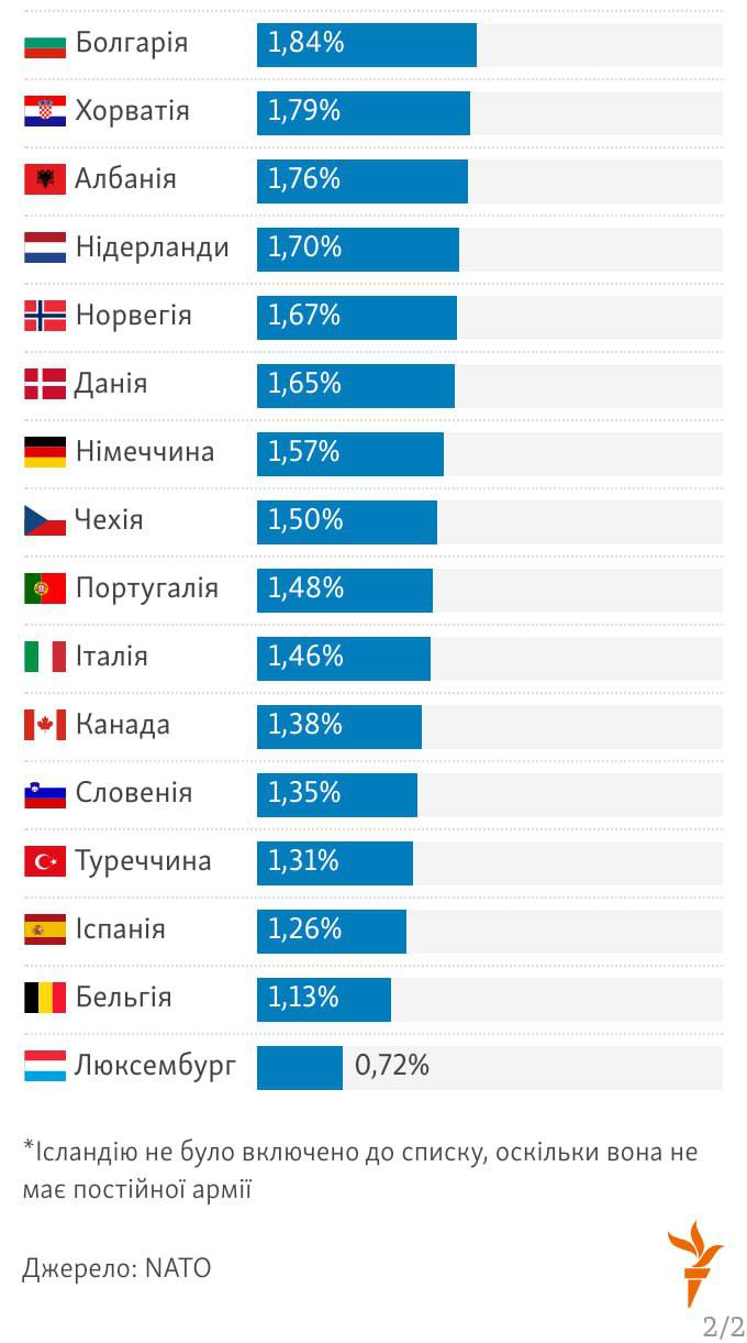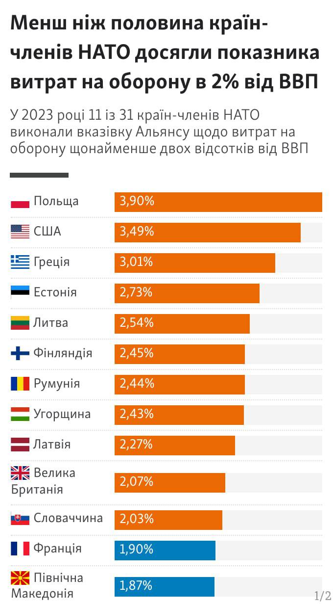 Сообщается, что всего 11 из 31 стран-членов НАТО в 2023 году достигли цели по расходу 2% ВВП на оборону. Расходы Альянса заметно выросли после полномасштабного вторжения рф в Украину.
