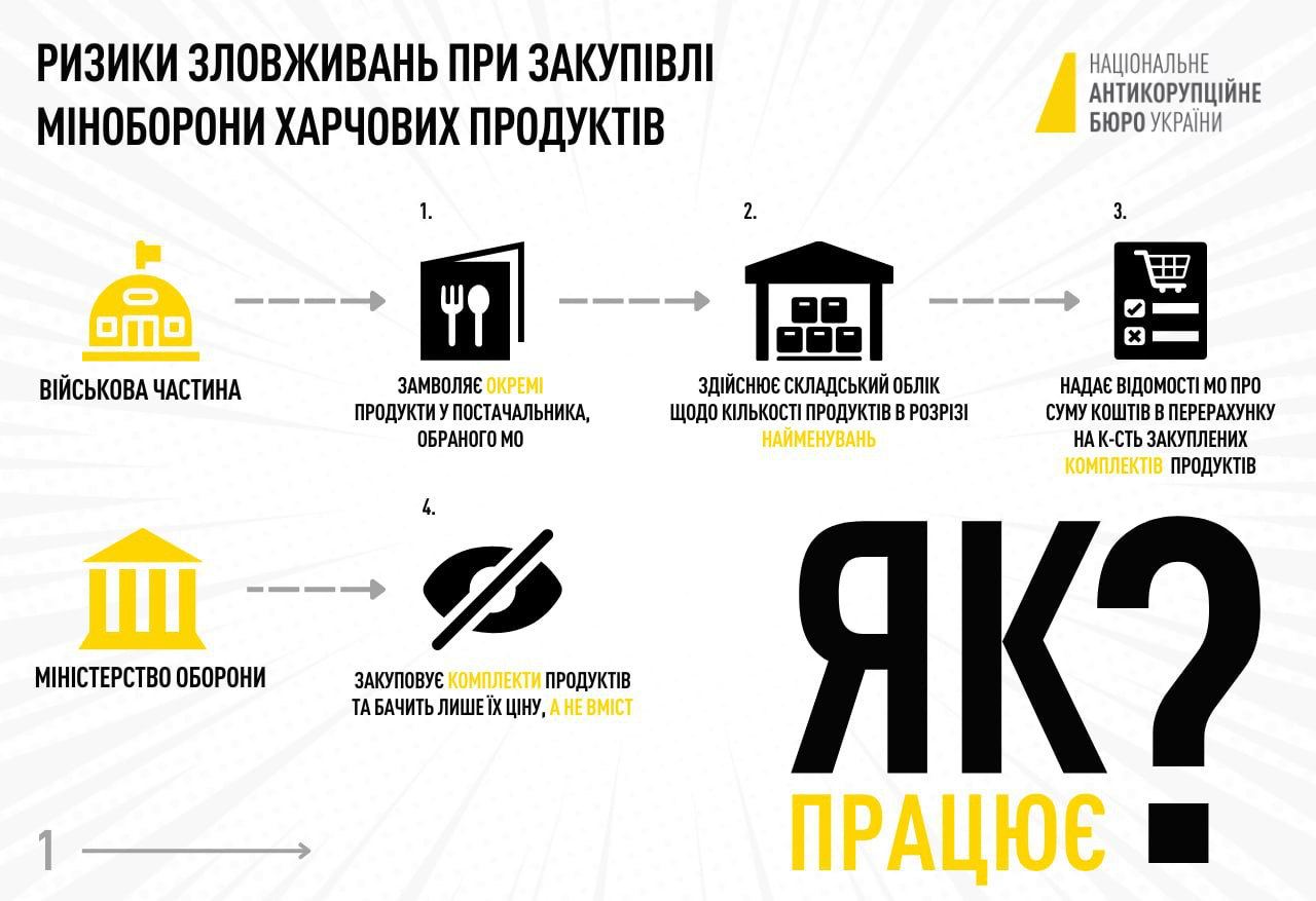 Национальное бюро расследований Украины публикует инфографику, как именно работает коррупционная схема в Министерстве обороны по завышению стоимости продуктов.