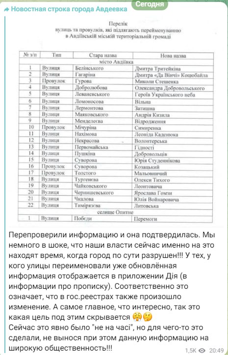 "Мы немного в шоке, что наши власти сейчас именно на это находят время, когда город по сути разрушен! Сейчас это явно было "не на часi", но для чего-то это сделали, не вынося при этом данную информацию для широкой общественности", - пишет канал "Новостная строка города Авдеевка".
