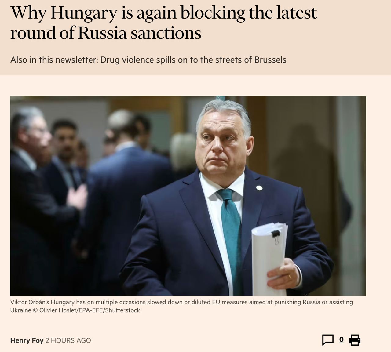 На вчерашней встрече послов ЕС Венгрия была единственным скептиком, сорвав подписание 13-го пакета, который ЕС хочет приурочить к годовщине вторжения, то есть принять в ближайшие 9 дней.