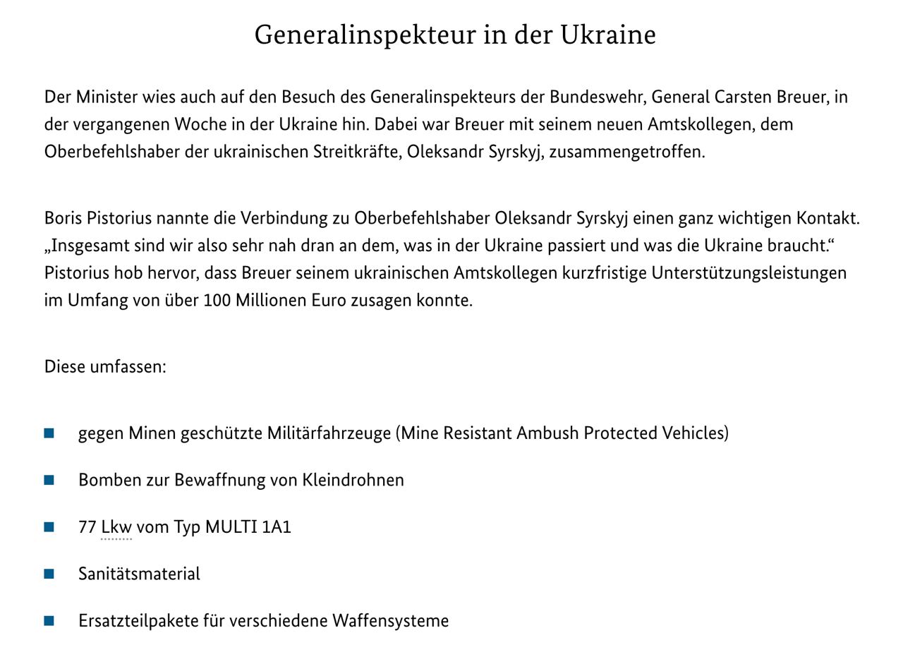Новая порция военной помощи поступит вскоре и от ФРГ. Как сообщает Минобороны страны, Германия вскоре передаст Украине такой помощи на 100 млн евро.