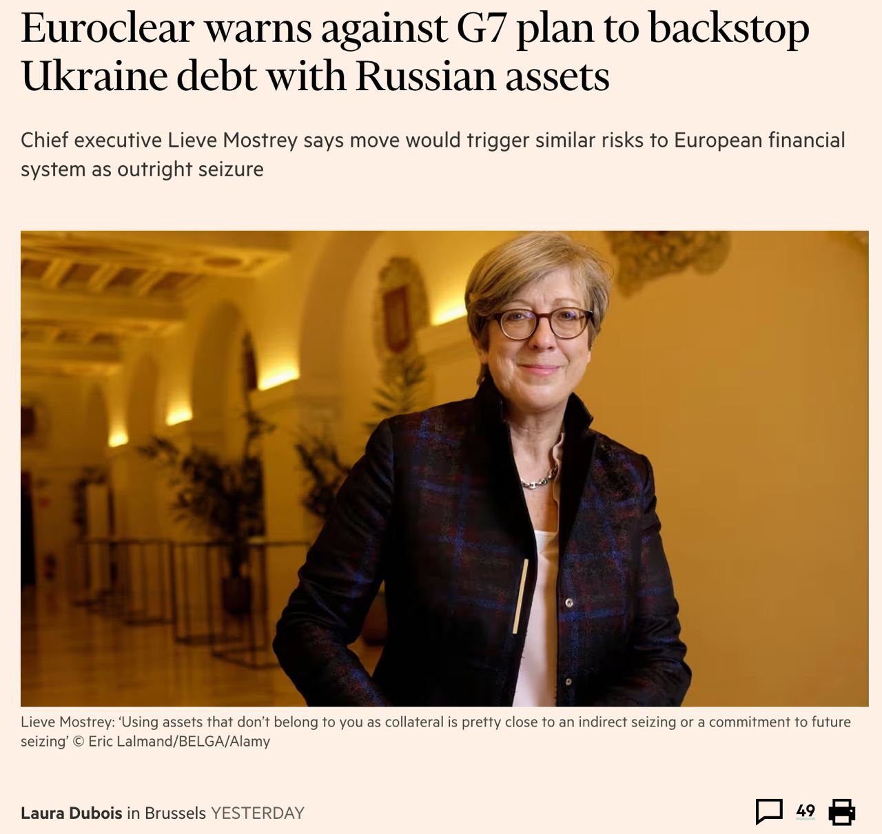 "Использование активов, которые вам не принадлежат, в качестве залога очень близко к косвенному аресту или обязательству о будущем аресте, что может иметь точно такие же последствия для рынков, как и прямой арест. Мы не представляем, как центральный российский банк может просто признать, что все было арестовано и что обязательства Euroclear перед ними перестали существовать", - заявила гендиректор инвестфонда Лив Мостри.