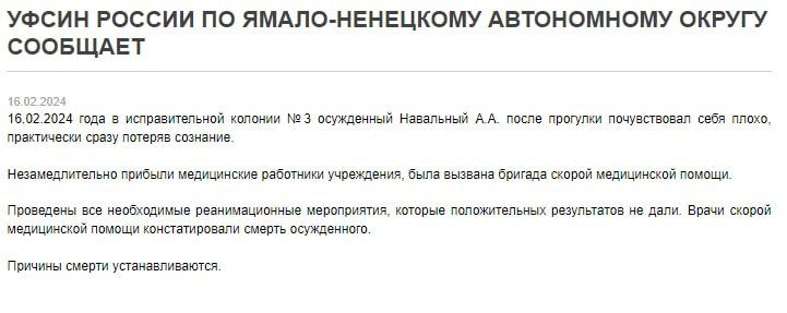 Управление Федеральной службы исполнения наказаний по Ямало-Ненецкому автономному округу заявило, что российский оппозиционер умер в исправительной колонии.