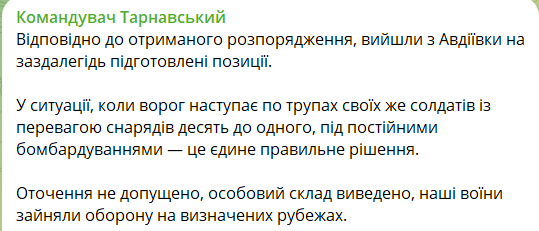 Окружение не допущено, личный состав выведен, наши воины заняли оборону на определенных рубежах", - Тарнавский.