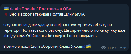"Оккупанты нанесли удар по инфраструктурному объекту на территории Полтавского района. Это привело к пожару, который уже ликвидировали. Обошлось без жертв и пострадавших", - сообщил он.