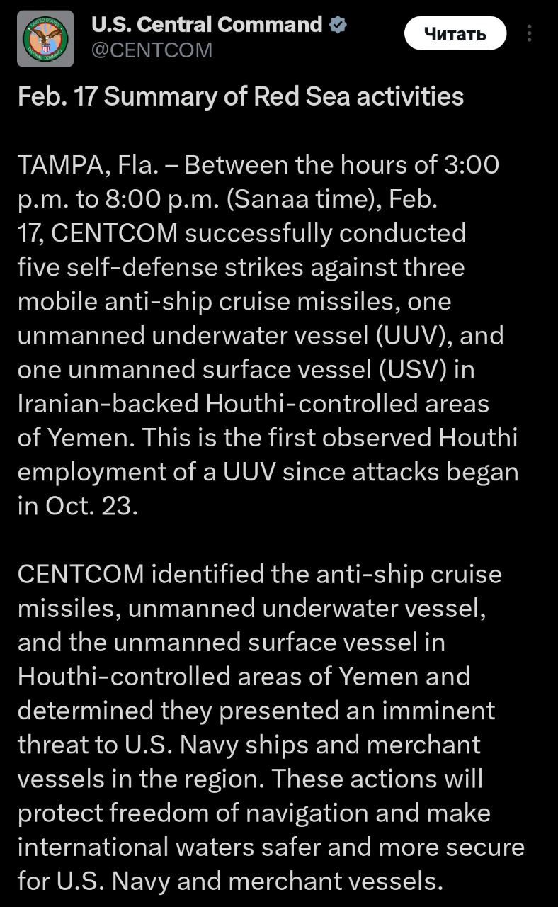 Заявляется, что беспилотник был обнаружен 17 февраля. США открыли огонь по одному беспилотному подводному кораблю и одному надводному. Также американцы нанесли пять ударов по трем противокорабельным крылатым ракетам хуситов.