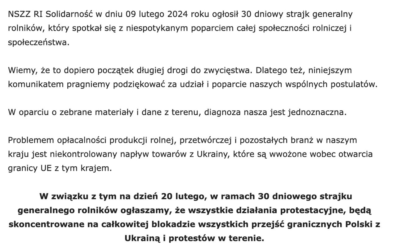 "Акции протеста начнутся в 12:00 на КПП Рава-Русская - Гребенне, Краковец - Корчева, Шегени - Медика. Протест продлится до 15 марта или до полной разблокировки украинской границы польскими протестующими. Мы будем требовать, чтобы польские фуры, которые возвращаются в Польшу, стояли в общей очереди с украинскими фурами. А так как поляки наши фуры запускают по одной в час, то, соответственно, и стоять польские перевозчики будут как и наши по 2-3 недели. На въезд в Украину блокировать польские грузовики мы не будем", - постановили украинские перевозчики.