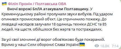 "Ночью вражеские БПЛА атаковали Полтавщину. В Кременчугском районе раздались звуки взрывов. Под ударом оказался промышленный объект. Это привело к пожару. К ликвидации последствий привлекали 18 единиц техники ГСЧС и 85 человек. К счастью, обошлось без жертв и пострадавших" - сообщил глава Полтавской ОВА.