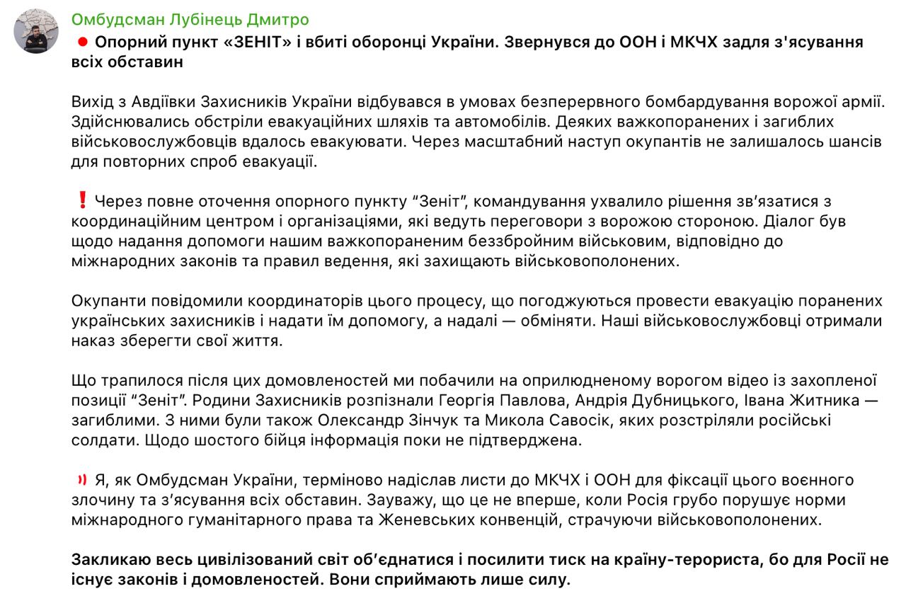 Омбудсмен Дмитрий Лубинец обратился в ООН и Красный Крест по поводу раненных украинских военных, взятых в плен на опорном пункте "Зенит" южнее Авдеевки, которых, как вчера заявила 110-я бригада ВСУ, затем расстреляли россияне.