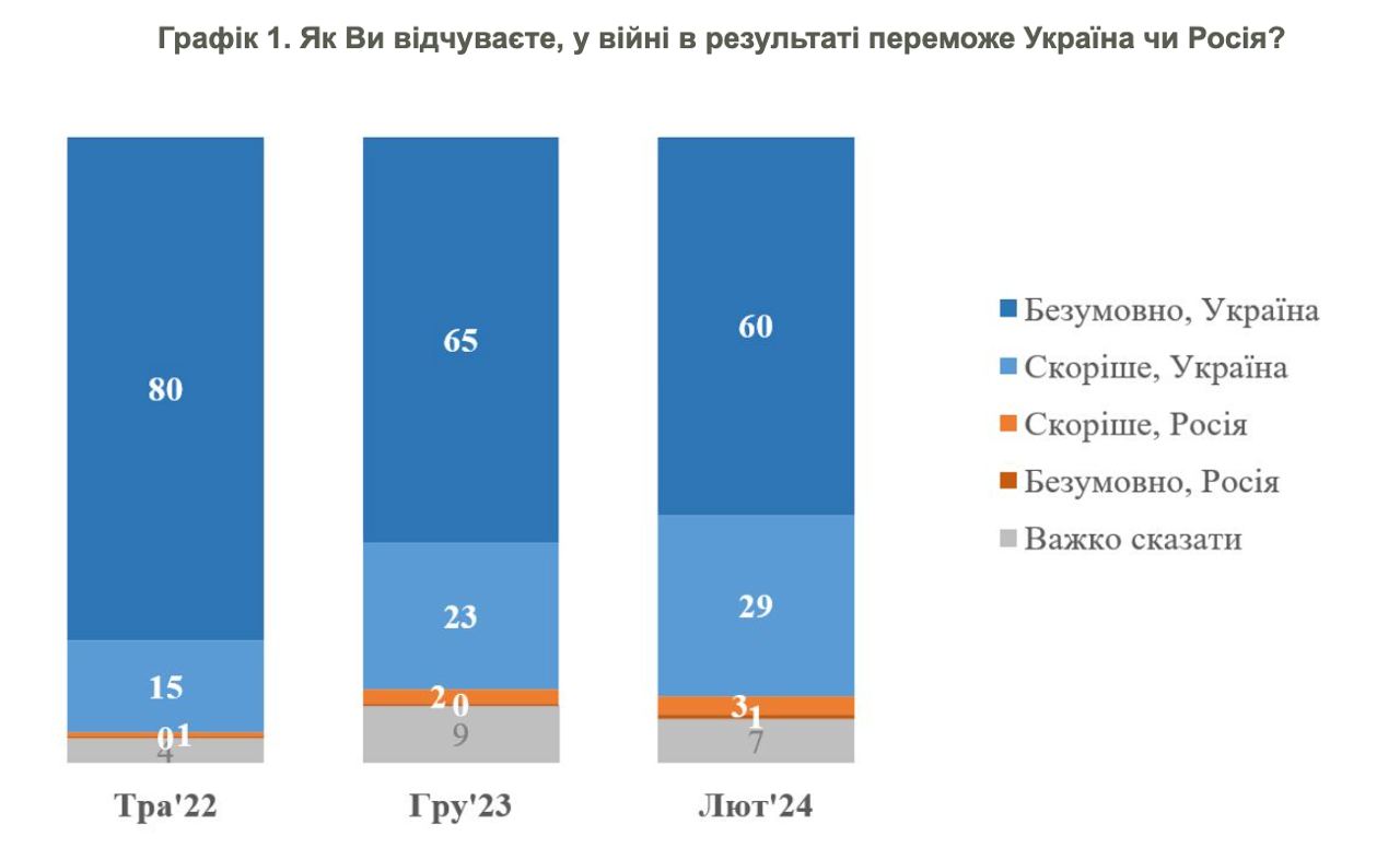 В мае 2022 года в победу безусловно верили 80% и скорее верили - 15%. В декабре 2023 стало 65% + 23%, а в феврале 2024 - уже 60% + 29%.
