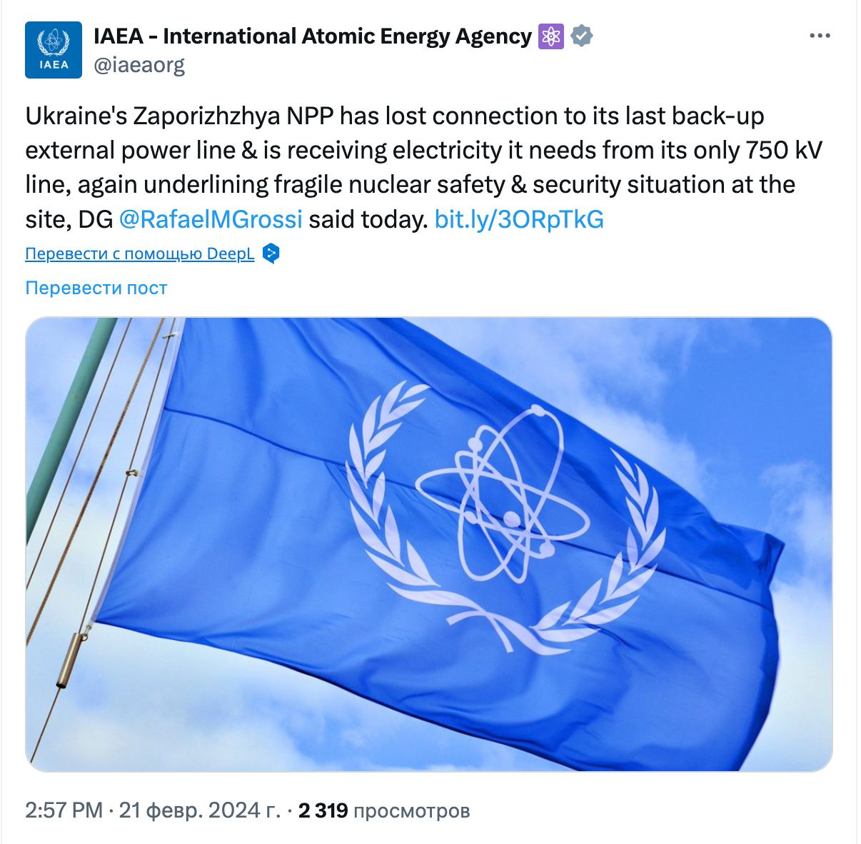 Сейчас станция получает электроэнергию от единственной линии 750 кВ, "что еще раз подчеркивает хрупкую ситуацию с ядерной безопасностью на объекте".