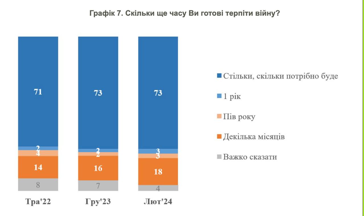 Готовность терпеть войну "столько, сколько потребуется" остается на том же уровне уже почти 2 года - в районе 71-73%. Но выросло и количество тех, кто готов терпеть только еще несколько месяцев - с 14 до 18%.