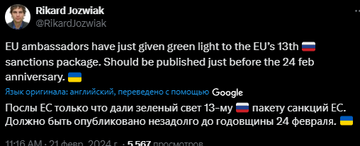 "Послы ЕС только что дали "зеленый свет" 13-му пакету санкций Евросоюза против РФ. Должны быть обнародованы непосредственно перед годовщиной на 24 февраля", – сообщил Йозвяк.