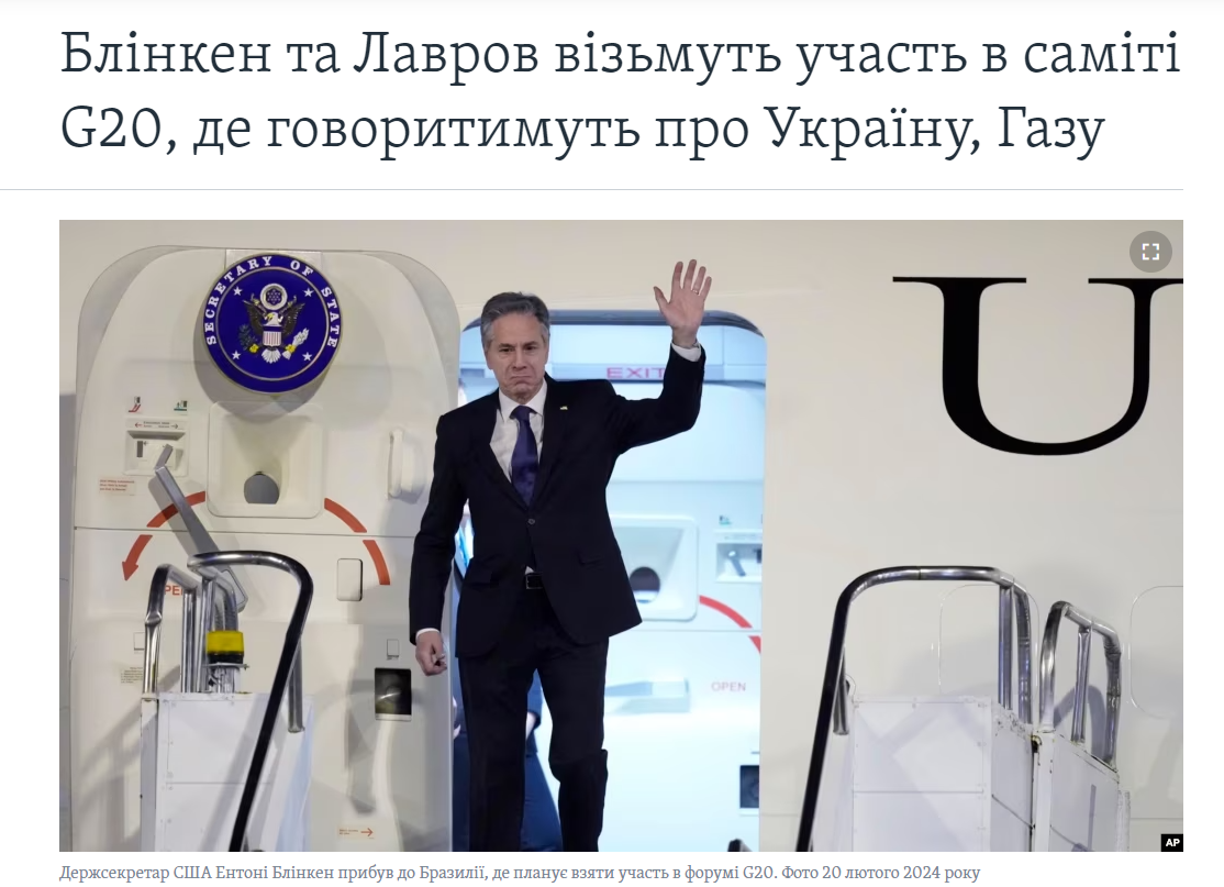 Госсекретарь США Энтони Блинкен и глава МИД РФ Сергей Лавров посетят первый саммит G20 в этом году, который состоится в Бразилии.
