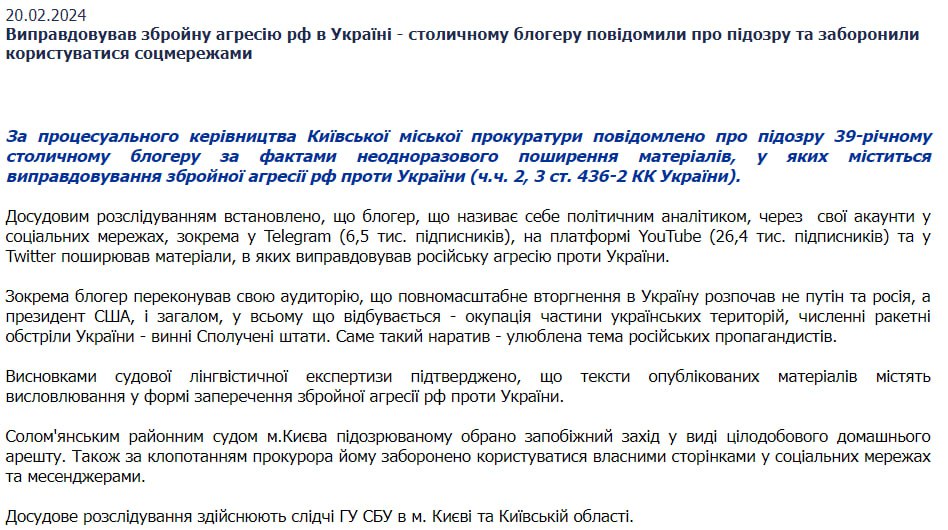 "В частности, блогер убеждал свою аудиторию, что полномасштабное вторжение в Украину начал не Путин и Россия, а президент США, и в общем, во всем происходящем – оккупация части украинских территорий, многочисленные ракетные обстрелы Украины – виновны Соединенные Штаты", – сообщает прокуратура.