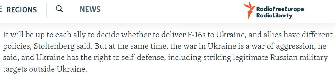 "По словам Столтенберга, каждый союзник будет сам решать, поставлять ли Украине F-16, и у союзников разная политика. Но в то же время, по его словам, война в Украине является агрессивной войной, и Украина имеет право на самооборону, в том числе на нанесение ударов по законным российским военным объектам за пределами Украины", - говорится в материале.