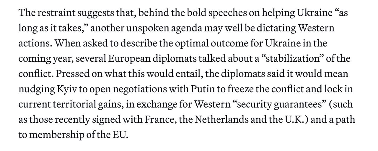 "Когда некоторых европейских дипломатов попросили описать оптимальный исход для Украины в наступающем году, они говорили о "стабилизации" конфликта. На вопрос о том, что это повлечет за собой, дипломаты заявили, что это будет означать подталкивание Киева к началу переговоров с Путиным, чтобы заморозить конфликт и зафиксировать текущие территориальные приобретения в обмен на западные "гарантии безопасности" (например, те, которые недавно были подписаны с Францией, Германией и Великобританией - Ред.) и путь к членству в ЕС", - пишет издание.
