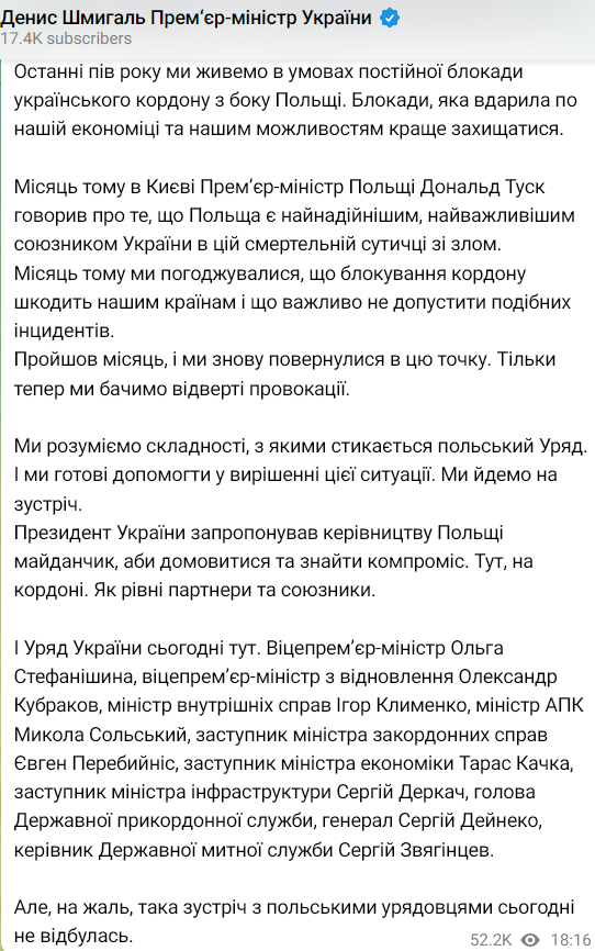 "Месяц назад в Киеве премьер-министр Польши Дональд Туск говорил о том, что Польша является самым надежным, самым важным союзником Украины в этой смертельной схватке со злом. Месяц назад мы соглашались с тем, что блокирование границы вредит нашим странам и что важно не допустить подобных инцидентов. Прошел месяц, и мы снова вернулись в эту точку. Только сейчас мы видим откровенные провокации", – заявил Шмыгаль.