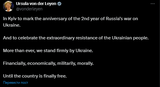 "В Киеве, чтобы отметить годовщину 2-го года войны России против Украины. И чтобы отметить чрезвычайную устойчивость украинского народа. Более чем когда-либо, мы твердо стоим рядом с Украиной. Финансово, экономично, военно, морально. Пока страна не станет совсем свободной", – написала фон дер Ляйен.