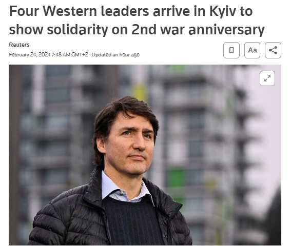 "Четыре западных лидера, включая премьер-министров Италии, Канады и Бельгии, прибыли в субботу в Киев, чтобы выразить солидарность с Украиной по случаю второй годовщины с начала боевых действий", — говорится в материале.