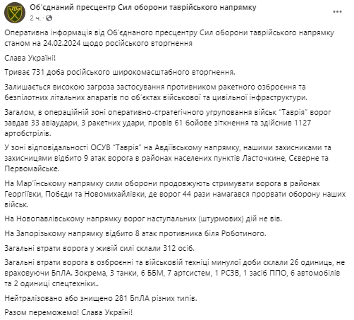 За прошедшие сутки украинские военные ликвидировали 312 российских оккупантов на Таврическом направлении. Также уничтожили 26 единиц техники россиян, не учитывая БПЛА.