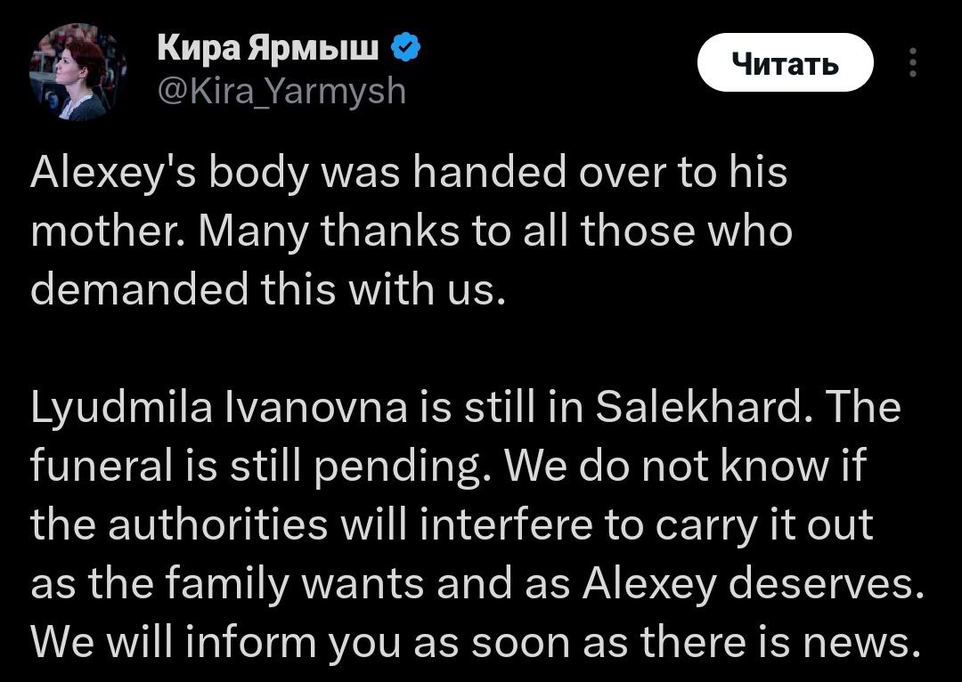 "Она (мать Навального - Ред.) отказалась вести переговоры со Следкомом, потому что у них нет полномочий решать, как и где ей хоронить сына. Она требует соблюсти закон, который обязывает следователей отдать тело в течение двух суток с момента установления причин смерти", - говорила Ярмыш.