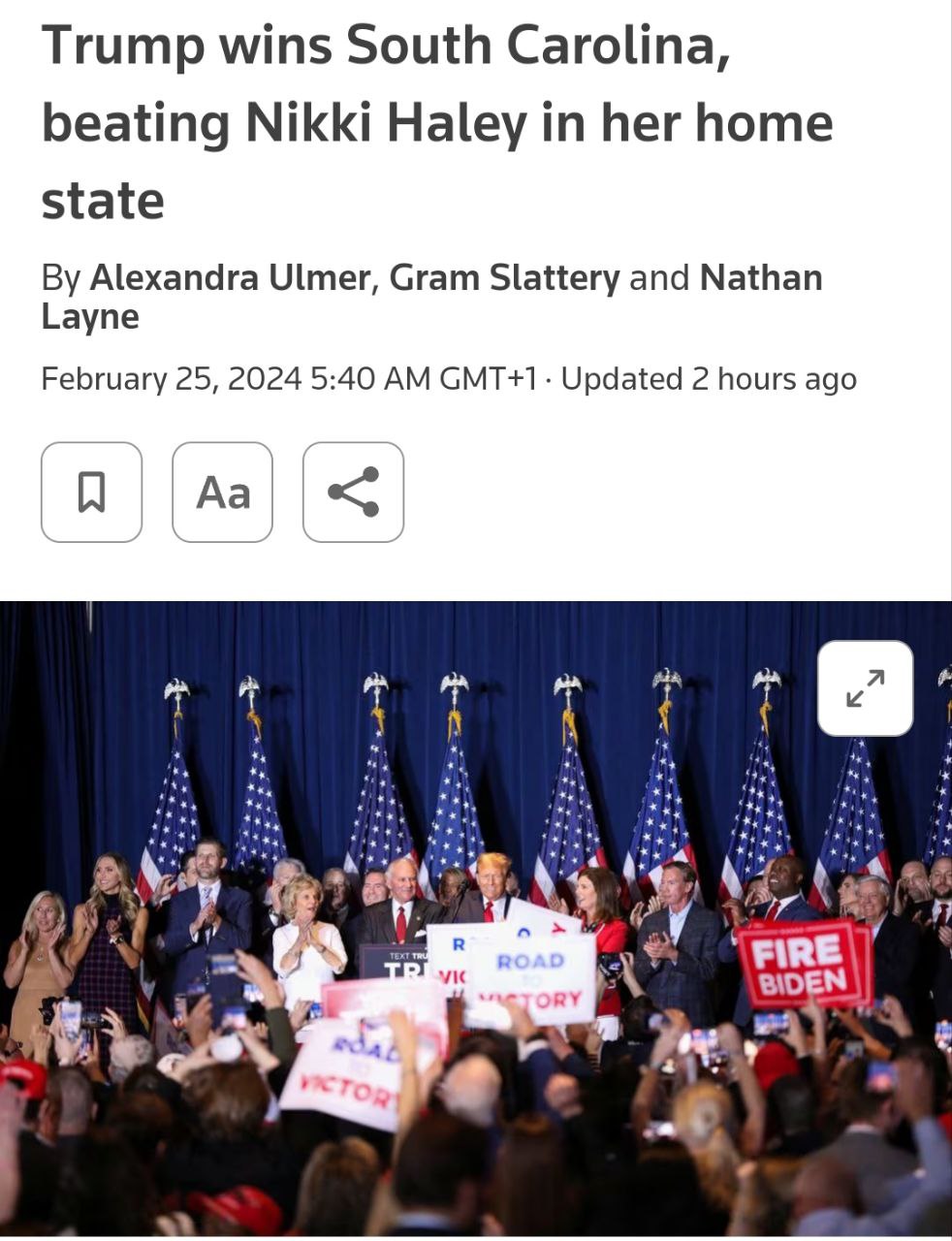 "На данный момент Трамп доминирует во всех пяти выборах - в Айове, Нью-Гэмпшире, Неваде, на Виргинских островах США и теперь в родном штате Хейли - не оставляя ей возможности к выдвижению от Республиканской партии", - делает вывод Reuters.