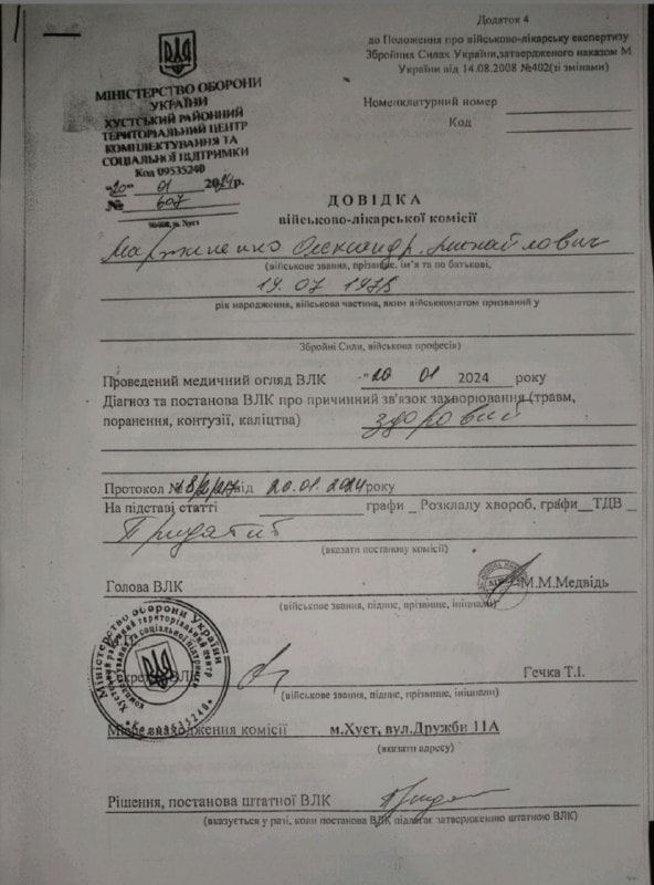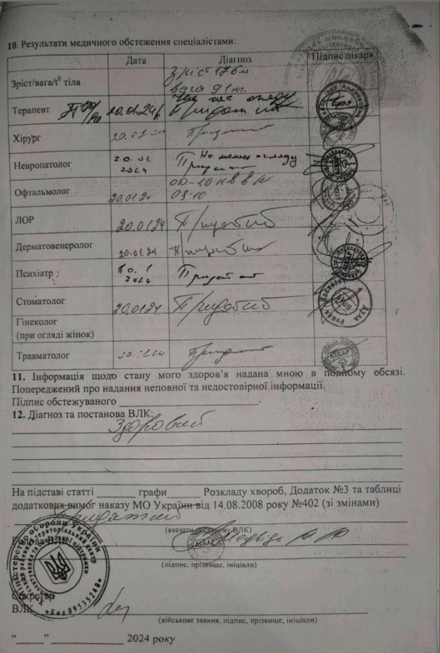 В Хустском военкомате его, как заявляет бывшая жена, избили, отобрали у него документы и мобильный. Затем отвели в подвал, где также издевались, после чего провели на медкомиссию, которая состояла, по его словам, из анализа крови из пальца. Комиссия сделала вывод, что Мартыненко годен к службе.