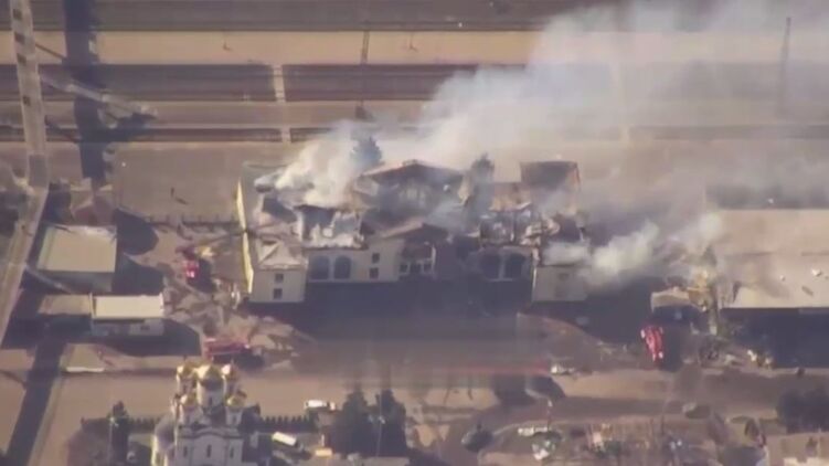 На видео видны масштабные повреждения кровли и дымящиеся развалины здания вокзала.