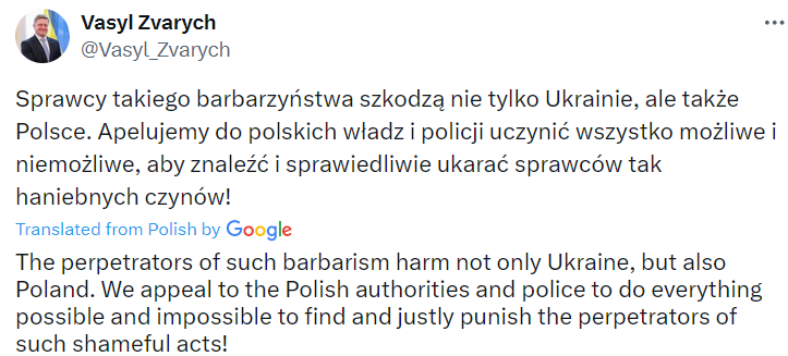 "Виновники такого варварства вредят не только Украине, но и Польше. Обращаемся к польской власти и полиции сделать все возможное и невозможное, чтобы найти и справедливо наказать виновных в таких позорных действиях", - говорится в сообщении.