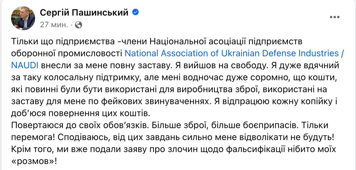 "Я очень благодарен за такую колоссальную поддержку, но мне одновременно очень стыдно, что средства, которые должны были быть использованы для производства оружия, использованы на залог для меня по фейковым обвинениям. Я отработаю каждую копейку и добьюсь возврата этих средств", - заявляет Пашинский.