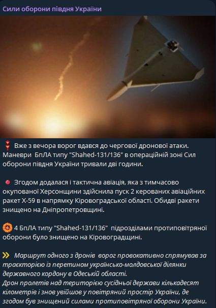 По их данным, сегодня ночью во время атаки по Украине российский беспилотник залетел на территорию Молдовы в районе Одесской области, пролетел там несколько десятков километров и вернулся в Украину, где его сбили.
