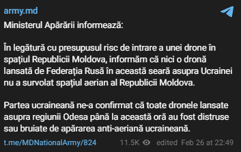 "О предполагаемом риске попадания беспилотника на территорию Республики Молдова сообщаем, что ни один беспилотник, запущенный Российской Федерацией (26 февраля, - Ред.) вечером над Украиной, не пролетел над воздушным пространством Республики Молдова", - говорится в заявлении Минобороны Молдовы.