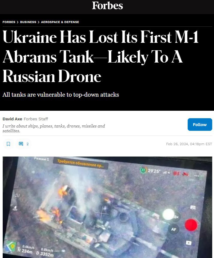 Журнал отмечает, что на другом снимке M-1 горит, очевидно, после удара того же или другого беспилотника.