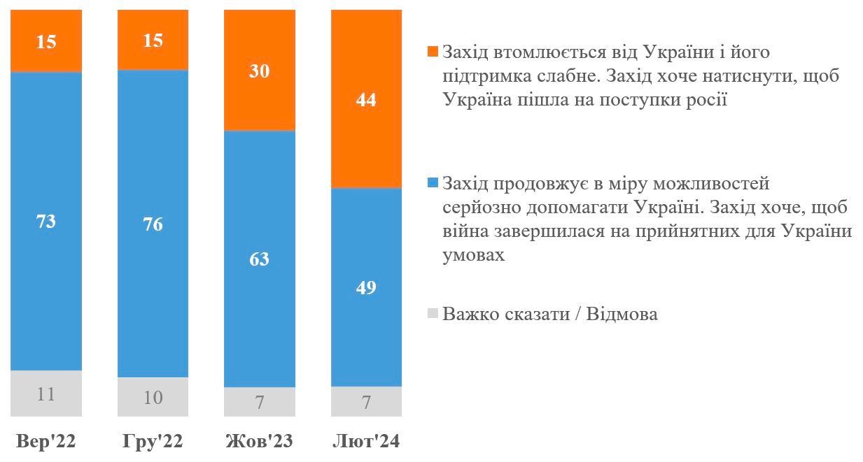 49% считают, что Запад продолжает поддерживать Украину по мере возможностей и хочет завершения войны на выгодных для Киева условиях. Чуть больше года назад было 76%.