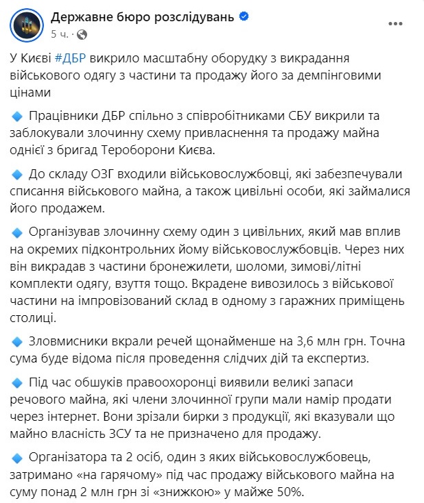 В Киеве организовали схему хищения военной одежды. Фото: ГБР