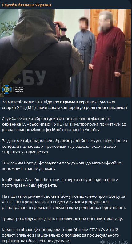 СБУ вручила подозрение руководителю Сумской епархии УПЦ. Его обвиняют в разжигании межконфессиональной ненависти.