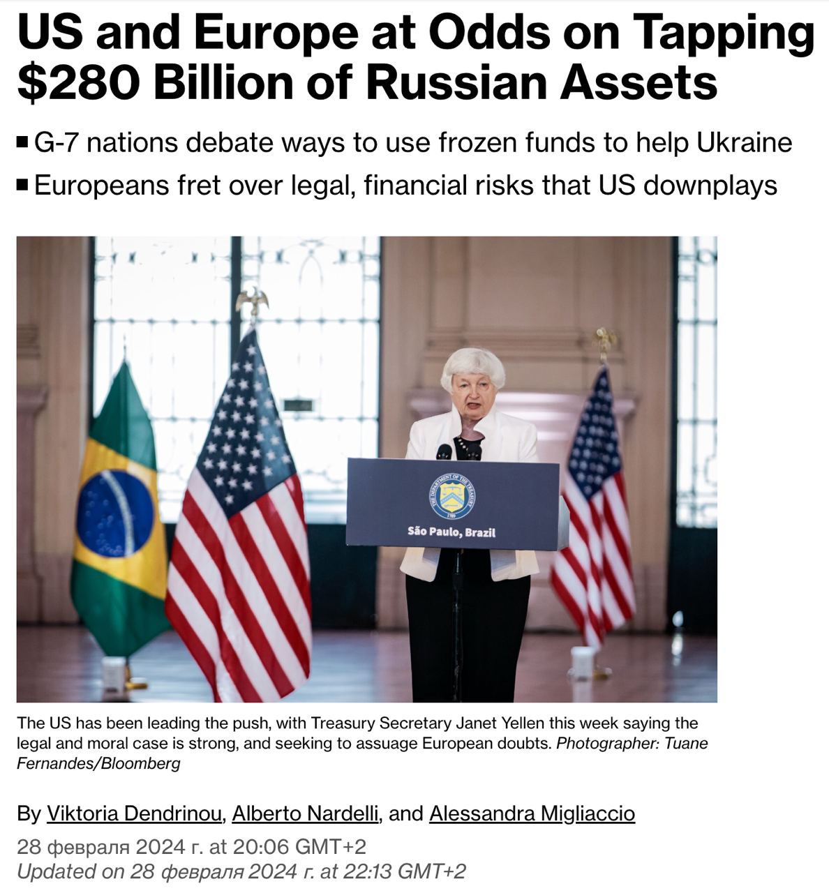 Напомним, основной держатель замороженных российских активов на Западе, бельгийский инвестиционный фонд Euroclear, тоже выступил против плана стран G7 ("Большой семерки") по использованию этих денег. Компания удерживает 191 миллиард долларов замороженных активов центробанка РФ из 260.