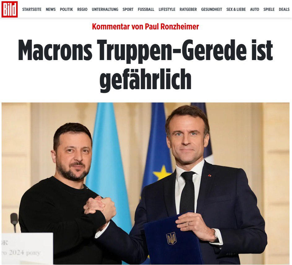 Заместитель главного редактора немецкого таблоида Bild Пауль Ронцхаймер считает, что президент Франции Эмманюэль Макрон своими заявлениями о посылке в Украину западных войск сильно навредил Киеву.