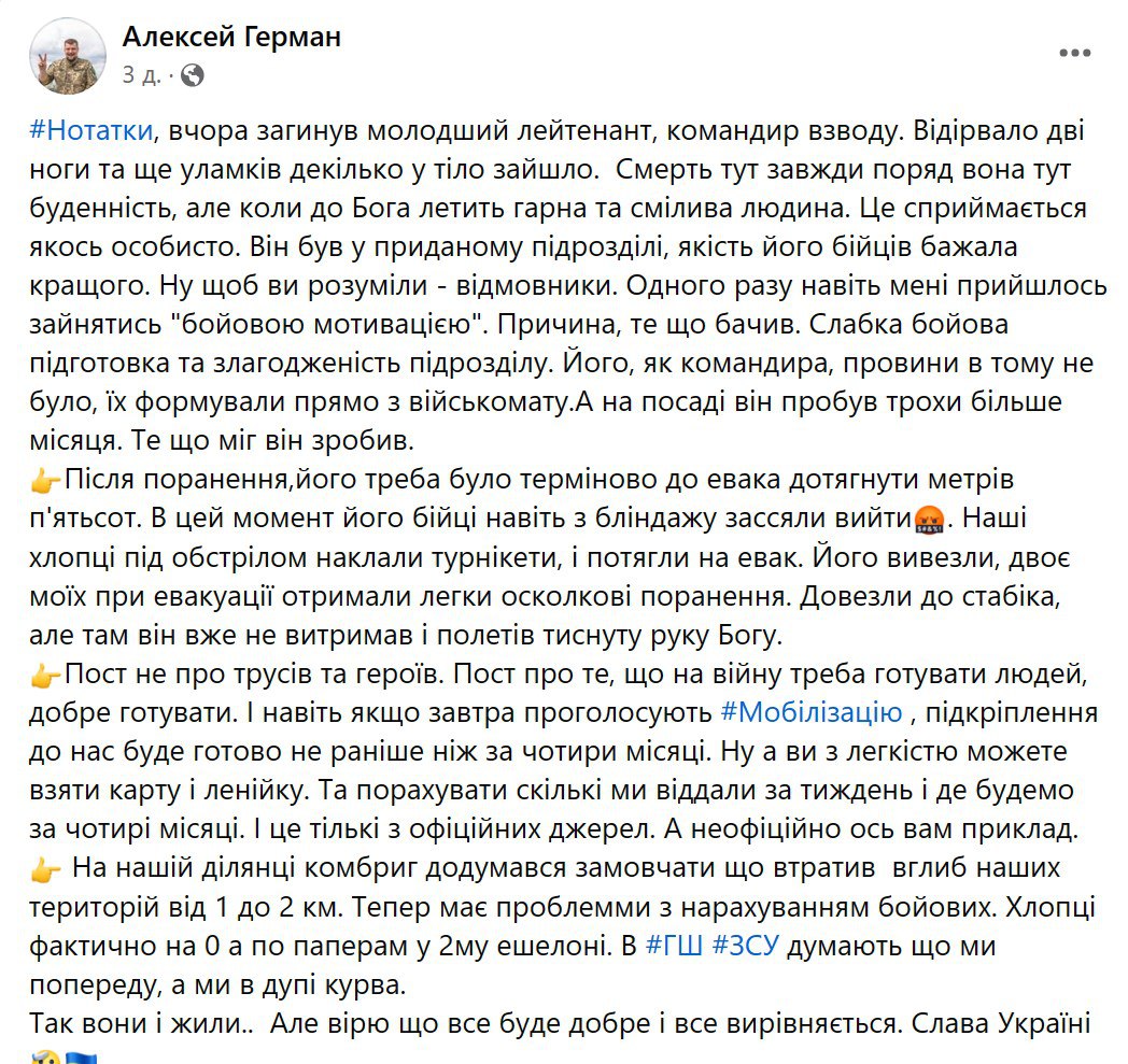 Он пишет о гибели командира взвода, где "качество бойцов желало лучшего". По словам Германа, во время обстрела они даже не вышли из блиндажа, когда их командира тяжело ранило. В итоге его эвакуировало другое подразделение.