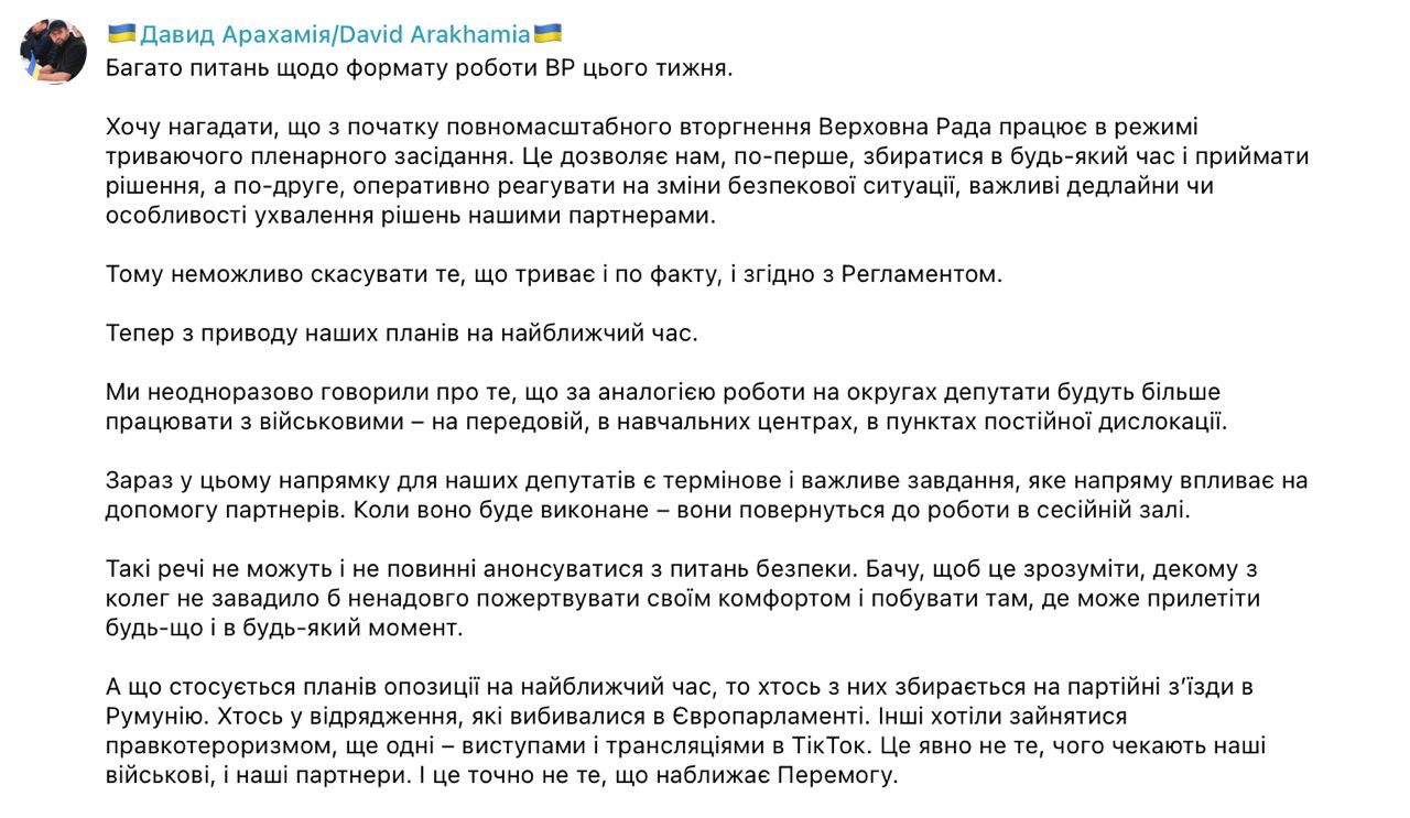"А что касается планов оппозиции на ближайшее время, то кто-то из них собирается на партийные съезды в Румынию. Кто-то в командировки, которые выбивались в Европарламенте. Другие хотели заняться правкотерроризмом, еще одни - выступлениями и трансляциями в ТикТоке. Это явно не то, чего ждут наши военные и наши партнеры. И это точно не то, что приближает победу", - написал Арахамия.