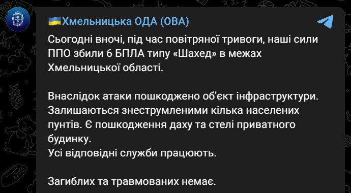 ОВА пишет, что силы обороны сбили шесть беспилотников, но в результате атаки был поврежден объект инфраструктуры. Обесточена часть населенных пунктов.
